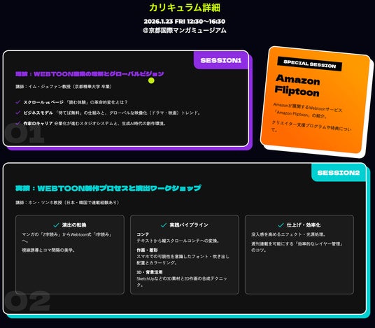 現在、スマートフォンに特化したフルカラー・縦スクロール形式の漫画『Webtoon(ウェブトゥーン)』は、韓国を中心に世界各地で爆発的な成長を遂げており、ドラマ化や映画化などのメディアミックスを通じてグローバルなヒットを記録する、現代のエンターテインメント業界において欠かせない市場となっています。本イベントは、世界基準のWebtoon制作ノウハウや市場戦略に直接触れる機会を提供し、日本が世界に誇る高品質な漫画文化と韓国の最先端技術を融合させ、日本から世界市場を席巻する次世代のWebtoon作家を育成・支援することを目指しております。