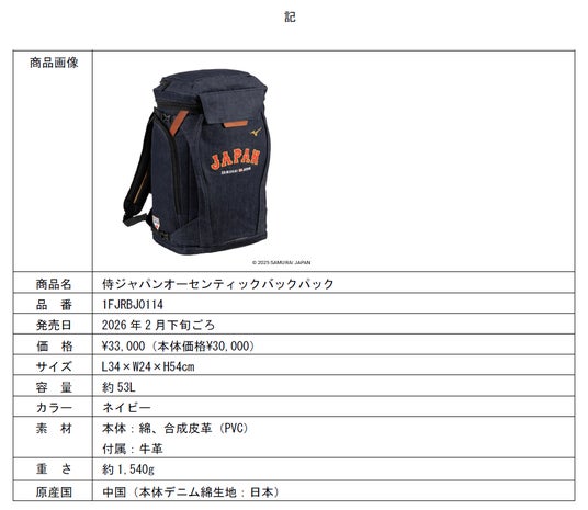 ミズノは、プロ野球選手が使用済みの木製バットをリサイクルし、バット再生デニムバッグ「侍ジャパンオーセンティックバックパック」を製作しました。このバッグは、2026年2月のキャンプから侍ジャパンの選手が使用します。1月上旬からミズノ公式オンラインで予約を受け付け、2026年2月下旬ごろにお届け予定です。