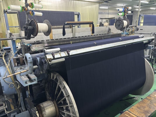 3. スリット撚糸を藍色に染色し、織り、デニム生地へ加工する。