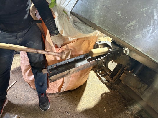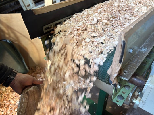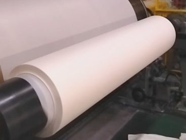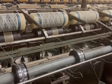 2. パウダー状の木くずをシート状に加工し、細く切断、スリット撚糸(ねんし)にする。
