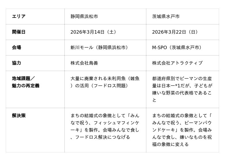 イベントでは、wedding march 2026のテーマ「祝福のシェア(共有体験)」に基づき、実際のカップルとまちの皆さまが参加する「まちの結婚式」を開催。その中で、パレード形式の祝福体験「ウエディングロード」と、地域課題を抱える食材を活用した「ウエディングケーキ」の提供が2エリア共通のメインコンテンツとなります。1.ウエディングロード