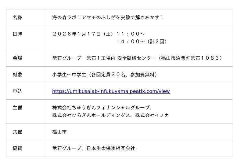 株式会社ちゅうぎんフィナンシャルグループ(岡山市 社長 加藤 貞則)は、株式会社ひろぎんホールディングス(広島市 社長 部谷 俊雄)と生物多様性保全の取組みの一環として、小中学生向け環境教育イベント「海の森ラボ!アマモのふしぎを実験で解きあかす!」を福山市にて開催しますのでお知らせします。