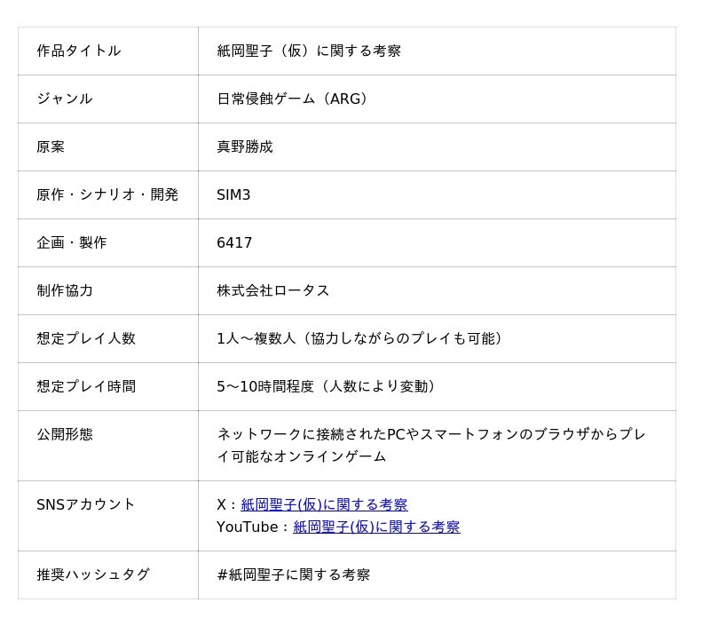 株式会社SANKYO(本社:東京都渋谷区 代表取締役社長:小倉敏男)は、ARGクリエイターSIM3氏と共同制作した日常侵蝕ゲーム『紙岡聖子(仮)に関する考察』を、2025年12月25日19時に公開いたします。