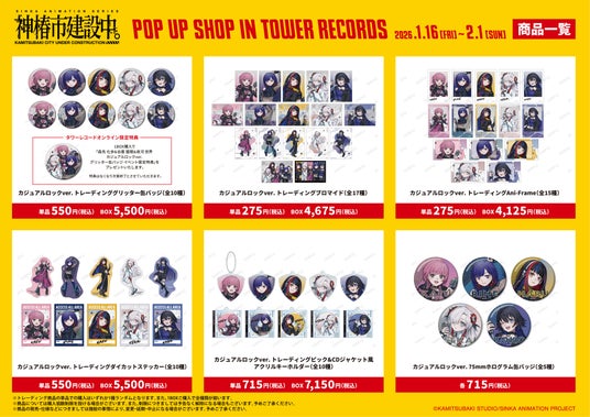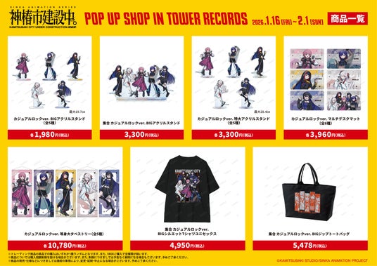 2026年1月16日(金)~2月1日(日)までタワーレコード 渋谷店、名古屋近鉄パッセ店、あべのHoop店、計3店舗とタワーレコード オンラインにて「TVアニメ『神椿市建設中。』 POP UP SHOP in TOWER RECORDS」の開催が決定いたしました。
