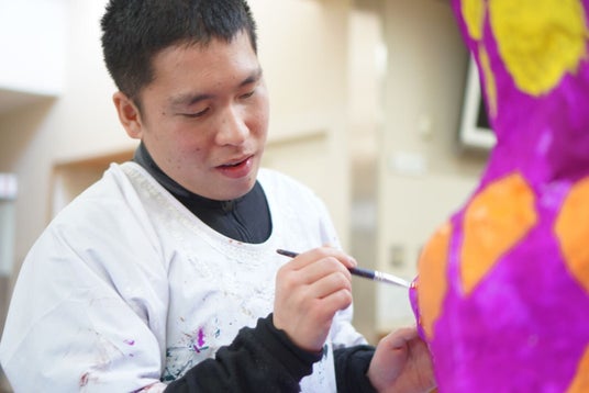 彼が計画する毎日の予定の中には、必ず創作活動が入っている。テーマも様々で動物や草花、風景や季節を表わすもの等、その日何を描くのかは彼のみぞ知るものである。始めに鉛筆でラフのように簡単に下描きをされ、その後はクレヨンや絵の具で力強く色鮮やかに塗り込まれていく。また絵画と合わせて彼の作風がそのまま作品から飛び出したかのように紙を丸めて形作り、様々な動物等を制作され、模様のように独特な色使いで着色されて完成していく。活発で元気、何事にも全力で取り組まれる彼の人柄が生み出す全ての作品に表出されている。