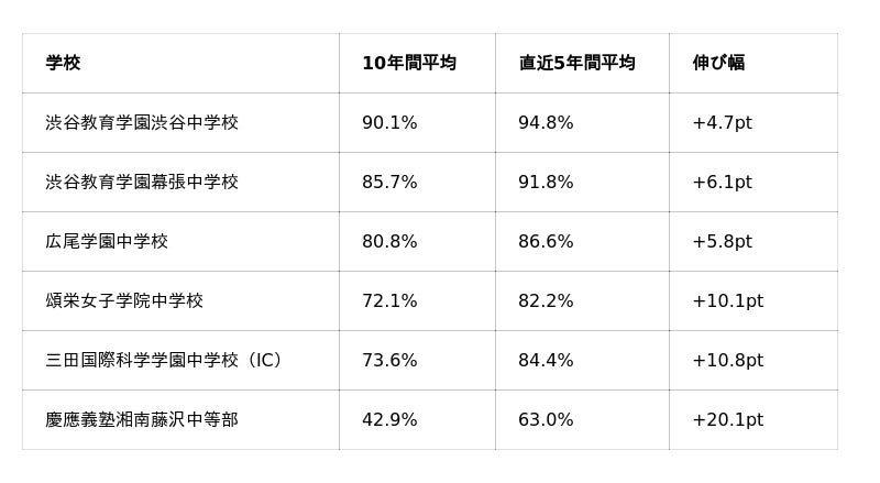 渋谷教育学園渋谷は平均90.1%を記録。渋谷教育学園幕張・広尾学園なども、直近5年はさらに上昇傾向に