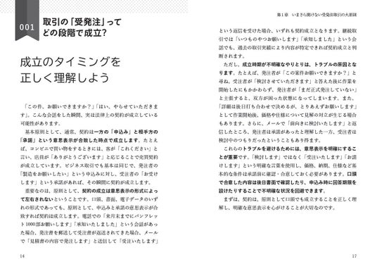 本書は、ビジネスパーソンがこれを機に改めて現場の受発注ルールを学べる実務書です。1つのテーマは見開き2ページとなっているため、先頭からじっくり読むもよし、気になる項目だけさっと引いて調べるもよしの内容となっています。