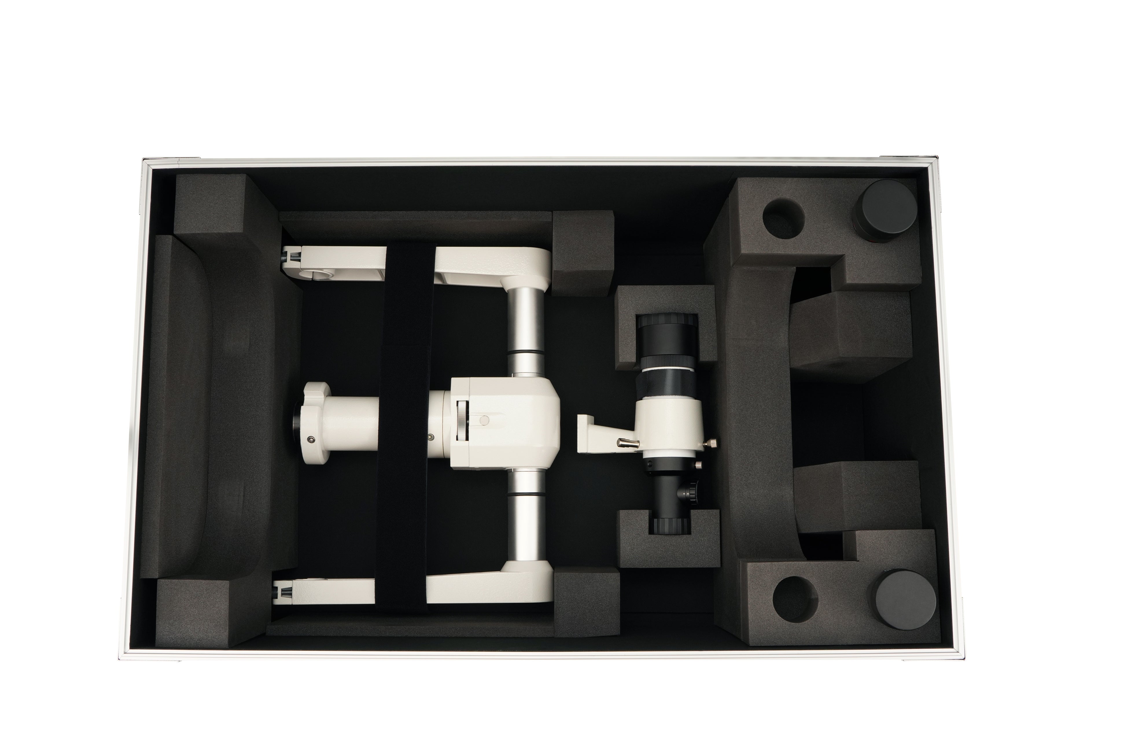 双眼鏡本体、HF2経緯台、ファインダー、接眼レンズ。これまで別々に持ち運ぶ必要があった機材一式を、このケース一つにまとめて収納できます。