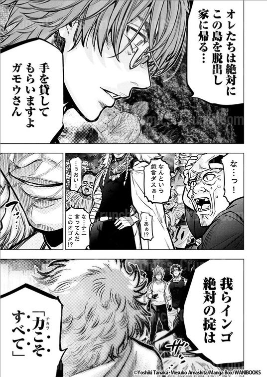 王母・チオモという絶対的なカードのみならず、ガモウ腹心の将<タスク>衆たちをも拘束して人質とした有利な状況で、ガモウに「全員が無事に島から出る」ための取引を迫る啓太。