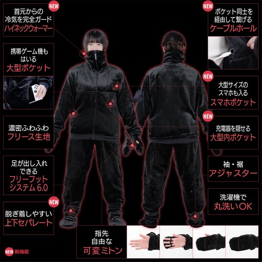 「ちょっとコンビニへ」を可能にする、待望の上下セパレートモデル。大容量のモバイルバッテリーを収納できる内ポケットと、そこから直接スマホへ給電できる「ポケットネットワークシステム」を搭載。位置情報ゲームや寝ながらのスマホ操作に最適な、現代ゲーマーのための戦闘服です。