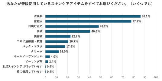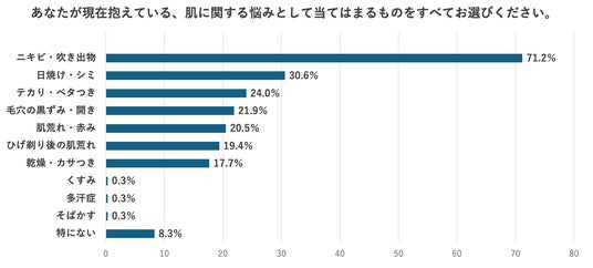 ・最も多い肌悩みは「ニキビ・吹き出物」で7割を超える結果となり、思春期特有の悩みが圧倒的に多いことが明らかになりました。また、屋外での活動が多い年代であることを背景に「日焼け・シミ」が3割を超え、「テカリ・ベタつき」や「毛穴の黒ずみ・開き」など、皮脂分泌に関わる悩みも2割前後と続いています。