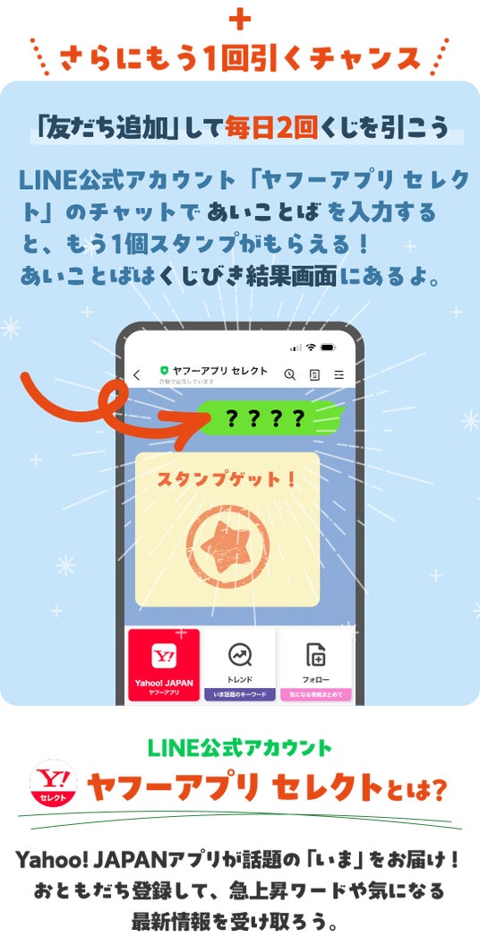 LINE公式アカウント 「ヤフーアプリ セレクト」と友だちになると、1日2回お年玉くじを引けます。