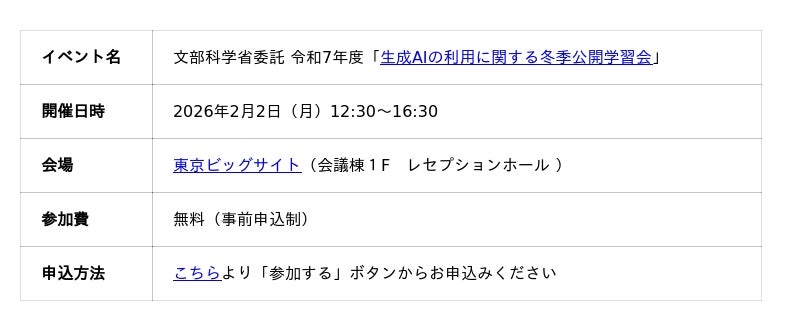 学校現場における適切な生成AIの利用に関して、生成AIパイロット校の成果を起点に、パネル&ポスターで学校現場における生成AI活用の現在地を学び合い、”見る・語る・持ち帰る”ことができる公開学習会を、2026年2月2日に東京ビッグサイト(東京都:江東区)にて開催いたします。