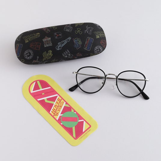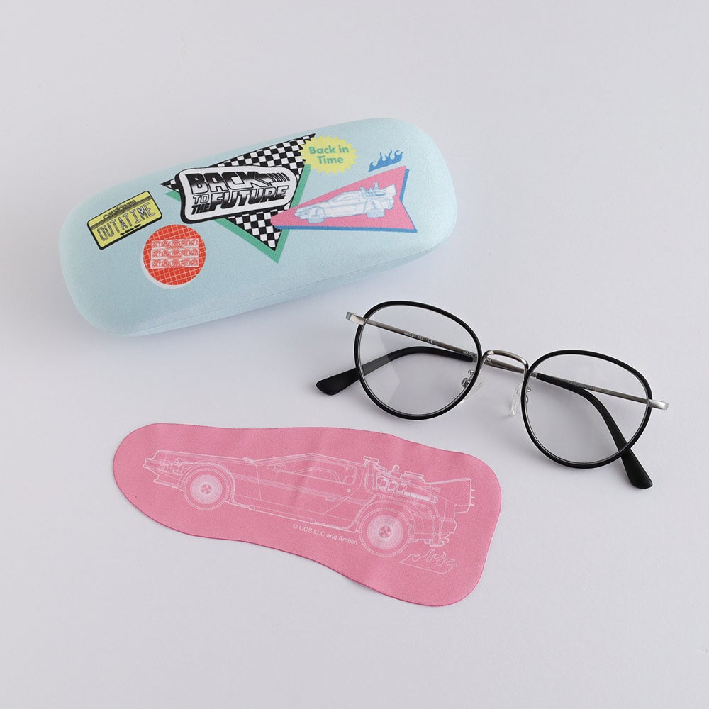 ロゴやモチーフが散りばめられたデザインのメガネケースとダイカットのメガネクロスがセットになっています。
