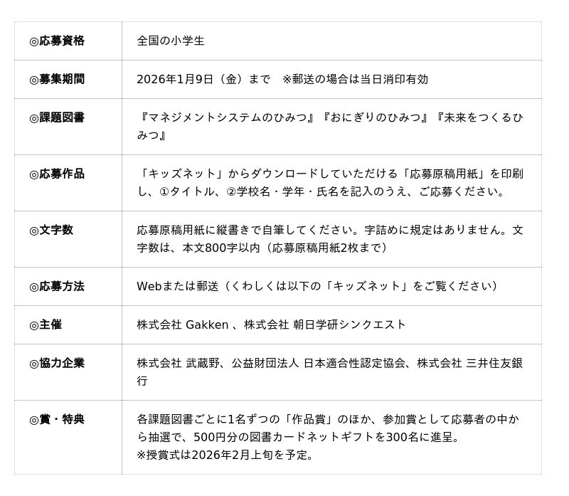 株式会社 学研ホールディングス(東京・品川/代表取締役社長:宮原博昭)のグループ会社、株式会社 Gakken(東京・品川/代表取締役社長:南條達也)は、株式会社 朝日学研シンクエスト(東京・品川/代表取締役社長:丸山洋)と共同で、「まんがでよくわかるシリーズ」の『読書感想文コンクール』を2026年1月9日(金)まで開催中です。