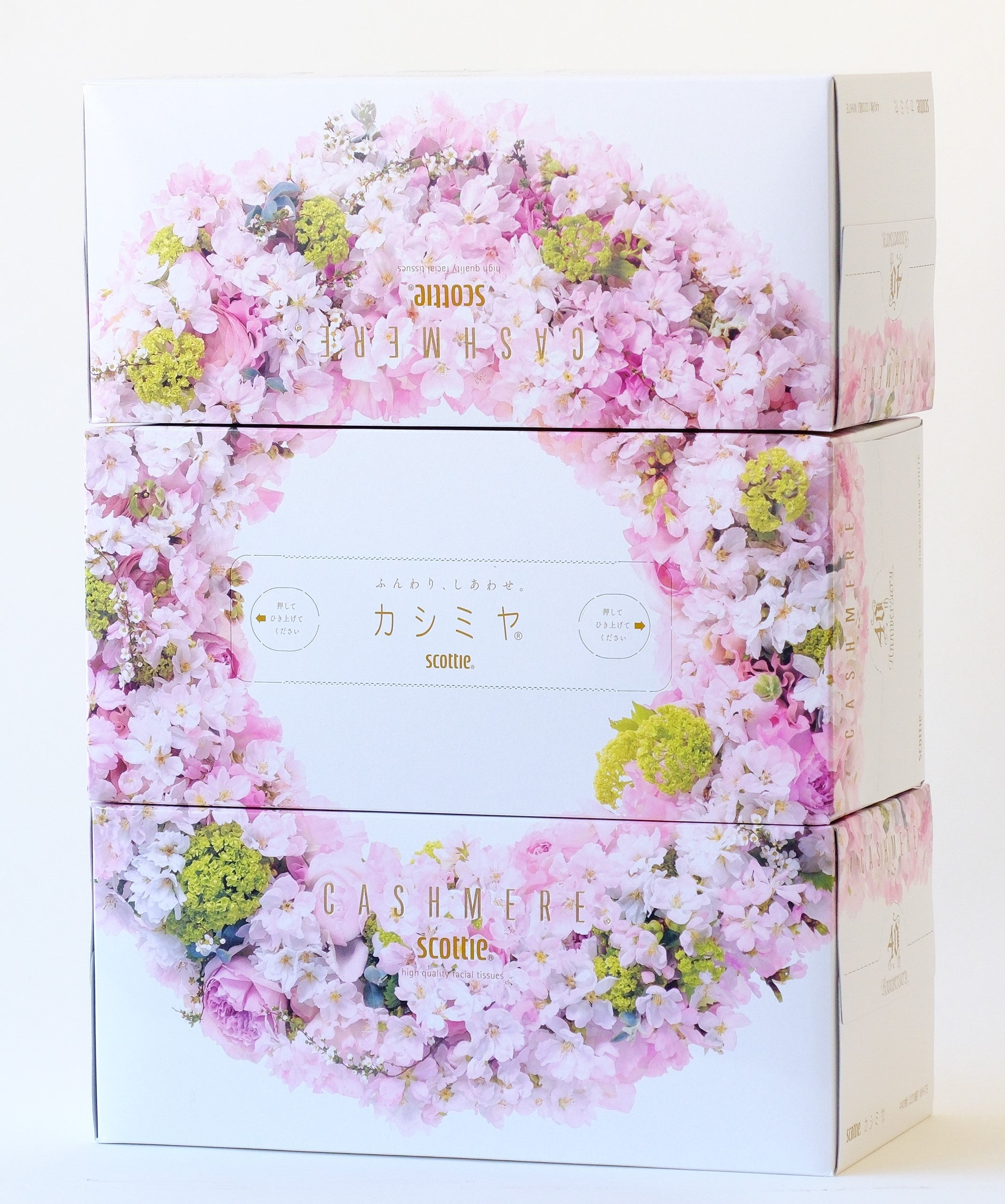 今年のパッケージデザインは「桜」をメインに、第一園芸株式会社が花を選定し、生花の桜や春の花々で丹念に制作したリースをもとに仕上げました。『スコッティ カシミヤ』の白いパッケージに、春の花を詰め込み、家の中でも春の訪れを感じられるデザインに仕上げました。