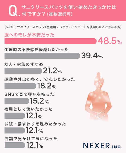 48.5%が「服へのモレが不安だった」、39.4%が「生理時の不快感を軽減したかった」、21.2%が「友人・家族のすすめ」と回答しました。