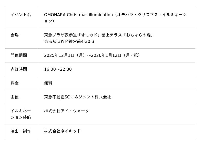 株式会社ネイキッド(本社:東京都渋谷区、代表取締役社長:村松亮太郎、以下NAKED)は、2025年12月1日(月)から2026年1月12日(月・祝)まで、東急プラザ表参道「オモカド」屋上テラス「おもはらの森」にて開催中のイルミネーション「OMOHARA Christmas illumination(オモハラ・クリスマス・イルミネーション)」の演出・制作を手がけています。