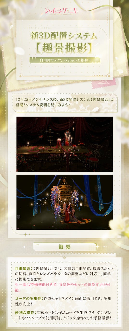 12/25メンテナンス後より新3D配置システム『趣景撮影』が登場いたします。『趣景撮影』では、装飾の自由配置、撮影スポットの切替、画面とレンズパラメータの調整などに対応して、簡単に撮影できます。