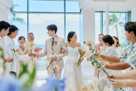 今回のリニューアルでは、リゾートならではの “空と海の広がり” をより引き立て、その美しさを最大限に感じられる内観となり、会場装花は、外の景色との一体感を感じられるよう、ホワイトをベースとしながらもナチュラルなパンパスやハイドランジア等、チャペル全体が自然となじむようなデザインを取り入れました。また、より感動を演出できる新しいセレモニーオプションとして、挙式前にカップルとゲストが対面できる心温まる演出の「ファミリーミート」、誓いの言葉をお互いの言葉で伝え合う事や両親やゲストへの感謝の気持ちを伝えることができる「レターセレモニー」、“これからのおふたりの人生に彩りを”という意味を込め、退場時にゲストの想いを花にのせてブーケにまとめる「IRODORIセレモニー」の3種のセレモニーが登場しました。当チャペル挙式限定で、コオリナの美しい空と海、幻想的なサンセットを表現した水彩アートの風合いの結婚証明書や、珊瑚や貝殻をモチーフとしたリングピローも新たにご用意し、おふたりだけのここでしかできないウェディングが叶います。