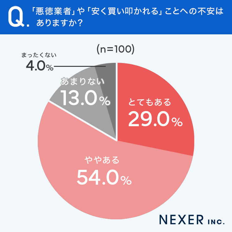 「とてもある」29%と「ややある」54%を合わせると、回答者の83%が「悪徳業者」や「安く買い叩かれる」ことへの強い不安を抱えていました。