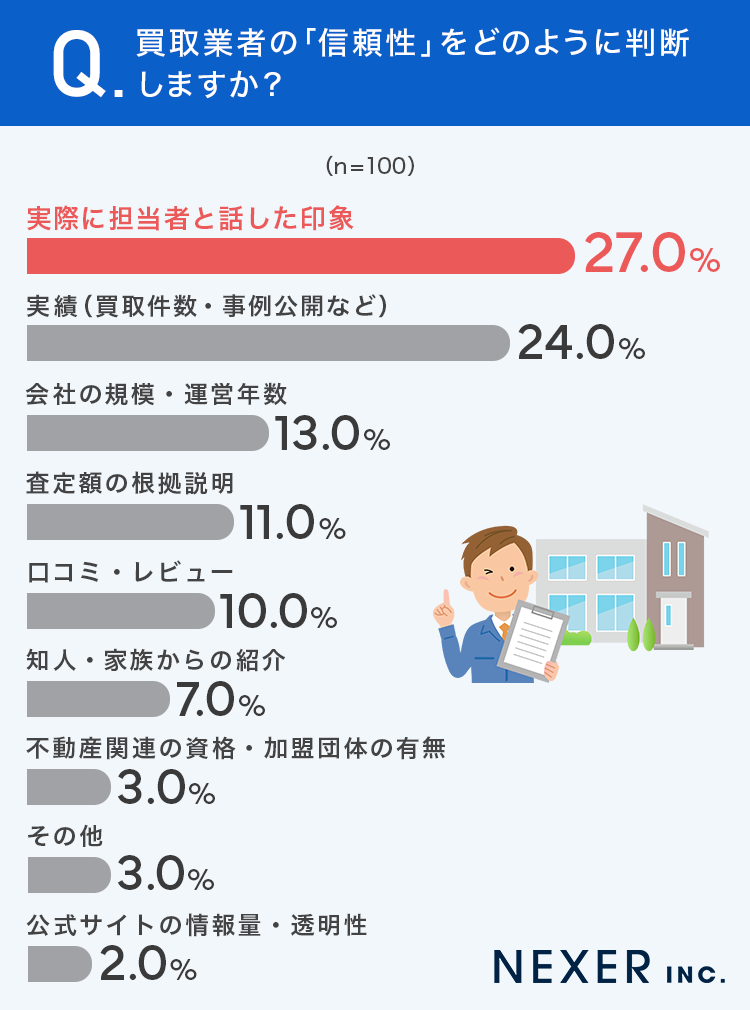 ということで今回はタクシエ(TAQSIE)と共同で、事前調査で「不動産買取を経験した、または検討中」と回答した全国の男女100名を対象に「不動産買取の信頼性の判断基準」についてのアンケートを行いました。
