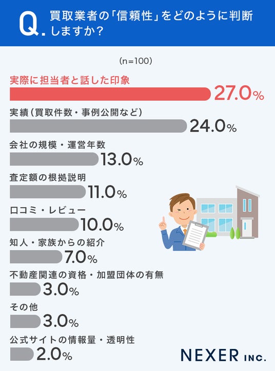 買取業者の信頼性の判断基準は、「実際に担当者と話した印象」が27%でトップとなり、対面での感覚や担当者の人柄が最も重視される結果となりました。