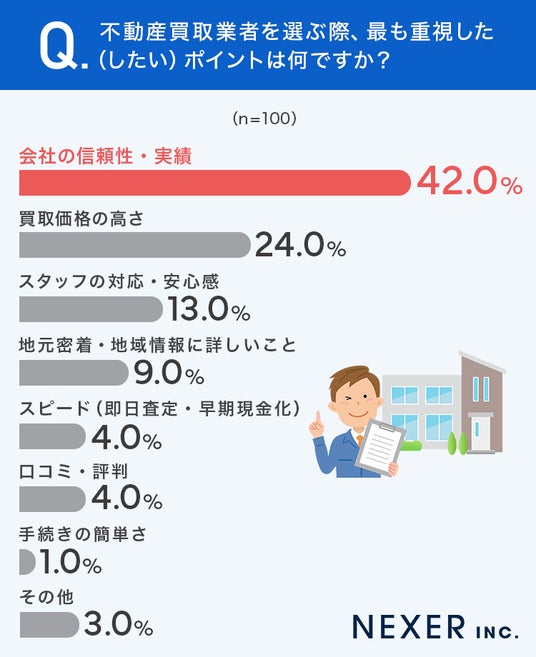 最も重視されるポイントは「会社の信頼性・実績」で42%を占め、金銭的な要素よりも安心感が優先されています。