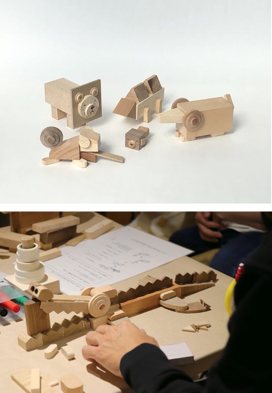 内容:カリモクの家具製造過程で出てくる様々な形の「端材」を活用して動物を作ります。「木」に触れてもらい、その良さを感じてもらえたら。そんな思いから生まれたワークショップです。
