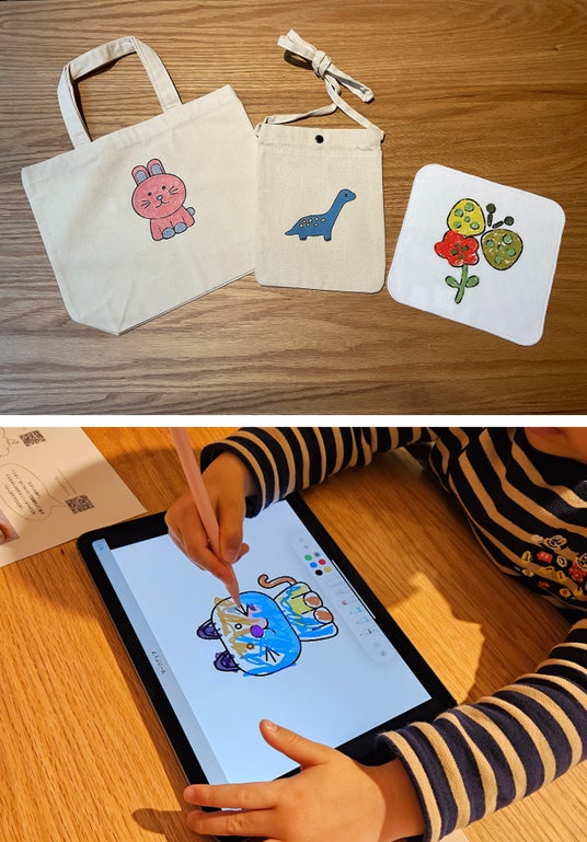内容:タブレット端末を使って、KEYUCAオリジナルのイラストを塗り絵し、世界にひとつだけのグッズを作るワークショップ。会場で塗り絵したデザインをバッグやハンカチなどへプリントし、後日ご自宅へ配送いたします。