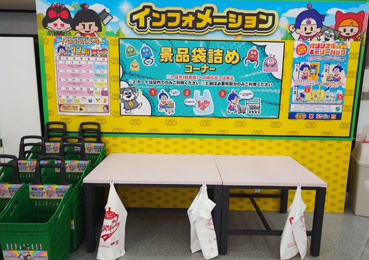 「大量に獲得したい」「見た目も楽しい」など、ご来店者の満足度を高める設計となっています。またカートに入れた景品を袋に詰めるための専用スペースも用意しています。
