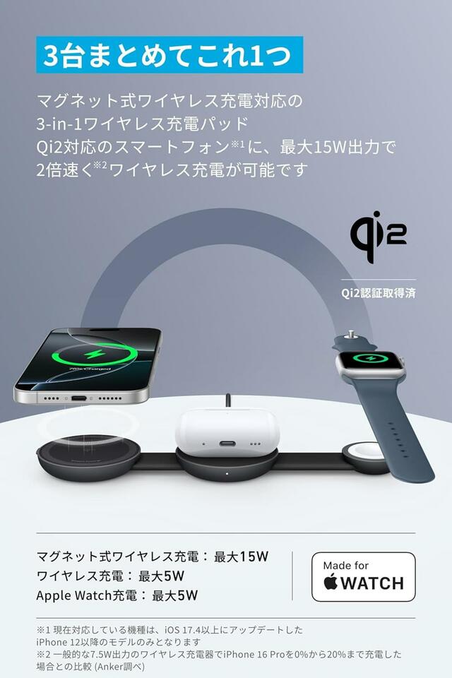 3-in-1設計により、スマートフォン・Apple Watch・ワイヤレスイヤホンを3台同時に充電できるのも大きな魅力。配線が散らからず、デスクやベッドサイドもすっきり整います。また、Ankerらしい安全設計で、日常使いから旅先まで安心して使える点も見逃せません。