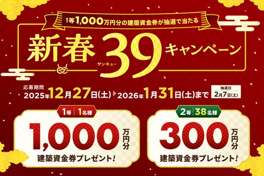 こうした社会経済環境の変化により、「土地価格は高いが、暮らしの質は妥協したくない」「限られた時間の中でも、家族が快適に過ごせる住まいを実現したい」という声が、住宅購入検討者の間で一層強まっています。このような時代背景を受け、新年のスタートに住宅購入を検討する方を後押しする取り組みとして、総額1.2億円超の建築資金券が当たる「新春39(サンキュー)キャンペーン」を開催します。申込期間は2025年12月27日(土)から2026年1月31日(土)まで、抽選日は2026年2月7日(土)。1名様に1,000万円分、38名様に300万円分、合計39(サンキュー)名様に建築資金券が当たるキャンペーンです。