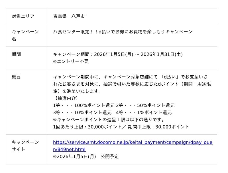 株式会社NTTドコモ(以下、ドコモ)は、全国の地域・商店街においておトクな「d払い(R)」キャンペーンを開催いたします。詳細は、下表のとおりです。