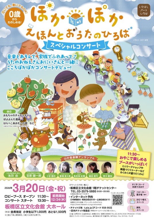 公益財団法人板橋区文化・国際交流財団(東京都板橋区)は、0歳から参加できる親子向け音楽事業「ぽかぽか☀えほんとおうたのひろば スペシャルコンサート」を、2026年3月20日(金・祝)、板橋区立文化会館 大ホールにて開催します。本公演は、ホールロビーで実施してきた同財団の人気プログラム「ぽかぽか☀えほんとおうたのひろば」を、初めて大ホールで展開する特別版です。