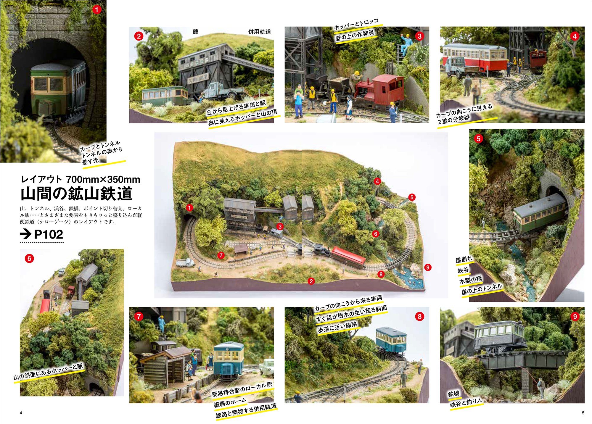 ・山岳部に鉱山鉄道、ローカル駅、鉄橋、渓流を配置して“角度を変えて映える”見せ方