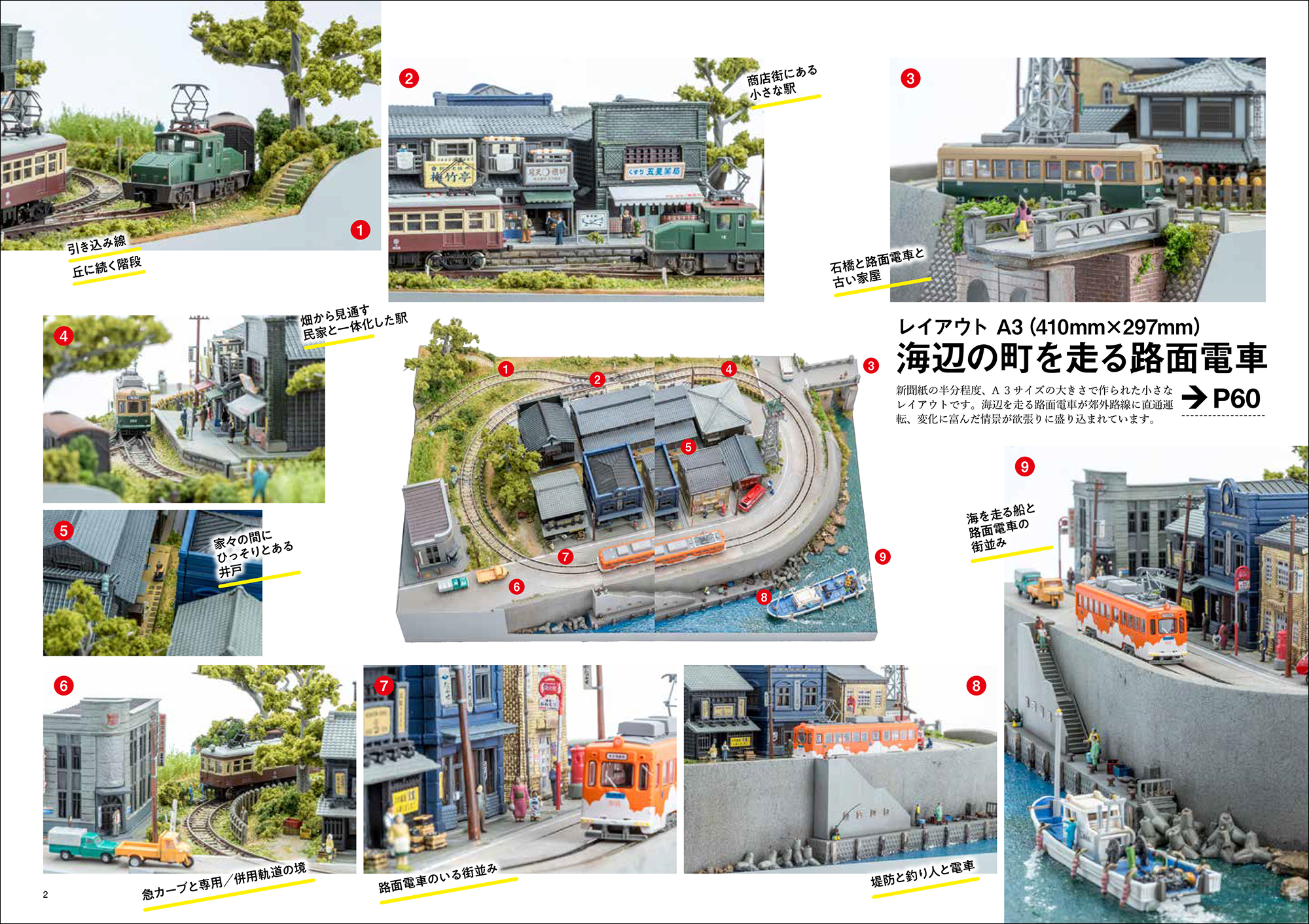 ギャラリー/準備しておきたいもの/[ほぼA4サイズ ジオラマケース]木造機関庫のある情景、雪国の無人駅、レンガ橋と渓流/[A3サイズ レイアウト]海辺の町を走る路面電車、地方都市の路面電車/[700mm×350mm レイアウト]山間の鉱山鉄道/レイアウト参考写真