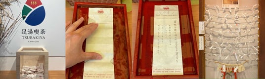 特典付き足湯セット: すべての足湯セット料金には、水に浸すと文字が浮かぶ「水御籤(みずみくじ)」と、選べる「オリジナル手拭い(持ち帰り可)」が付属します。