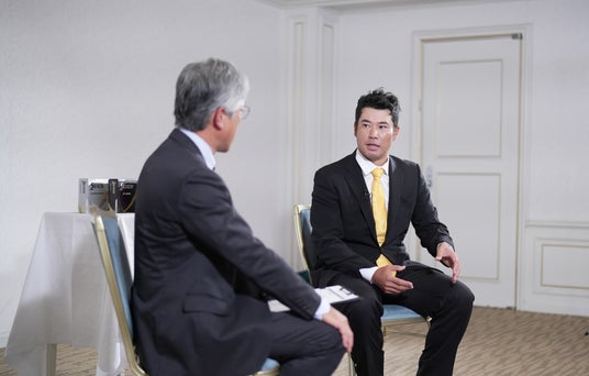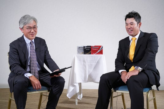 今回で11回目となる松山選手の特別番組はこのほど、東京都内で収録が行われました。スーツ姿で登場した松山選手をインタビュアーとして出迎えたのは、PGAツアーの解説でおなじみの佐藤信人プロ。