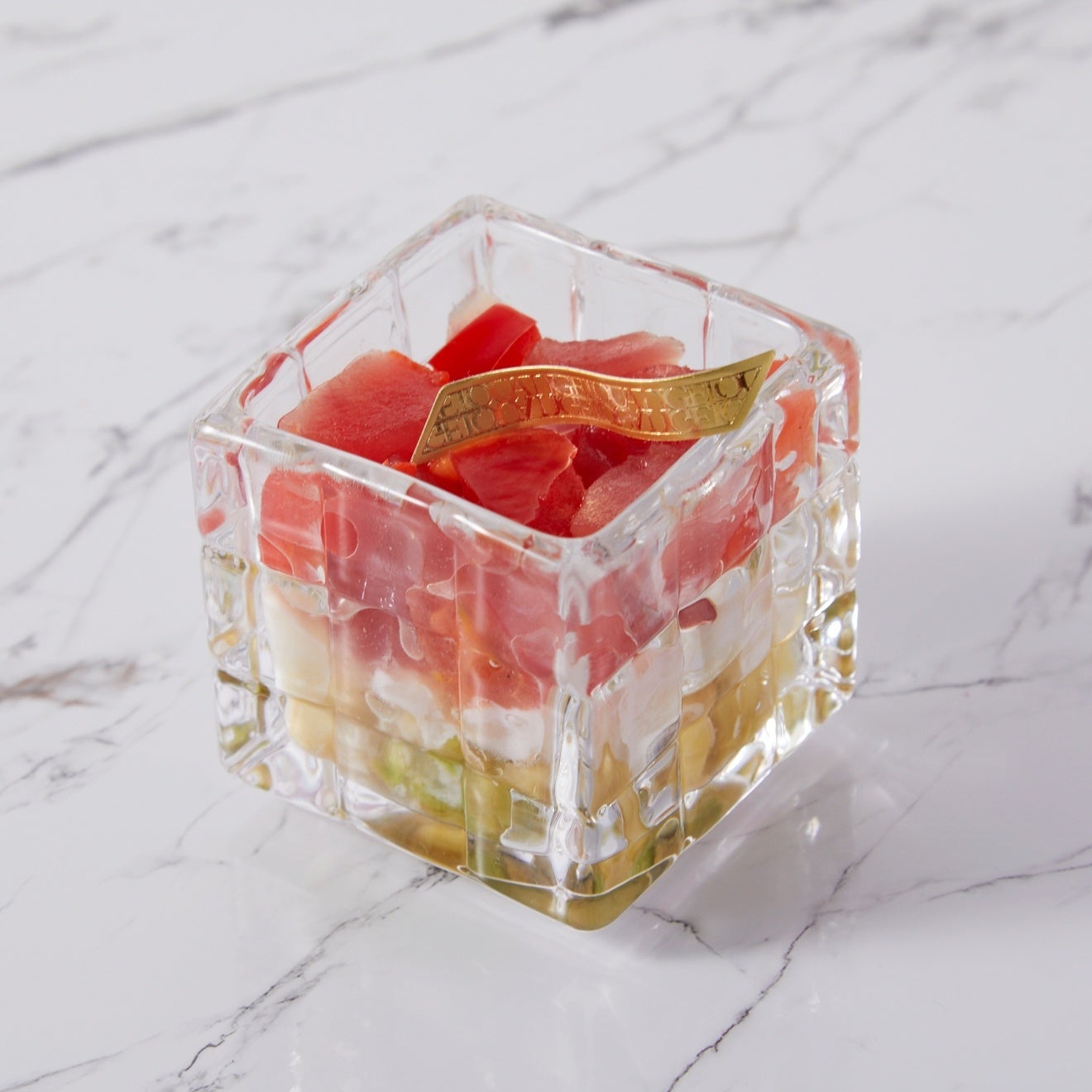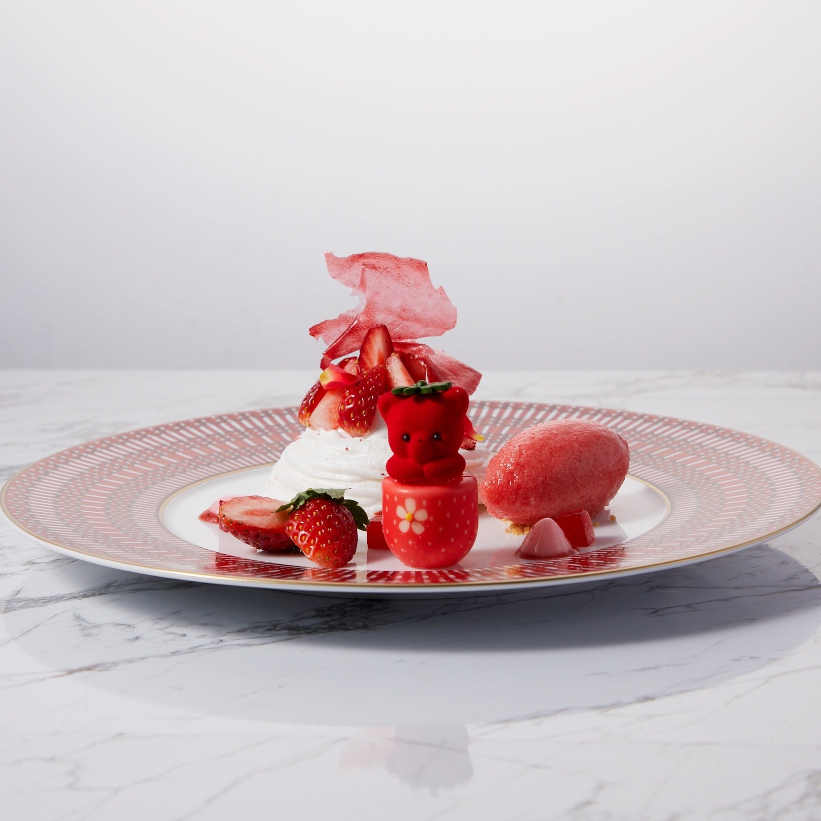 さらに、旬の国産苺を主役にしたデザートプレート「ムラング フレーズ」も登場。コク深いチーズクリームを真っ白なメレンゲで包み込み、苺のマリネやソルベ、ジュレを重ねた、苺尽くしの一皿です。フランス・バカラ社〈アルカディア レッド コレクション〉のプレートとともに、視覚でも味わいでもお楽しみいただけます。