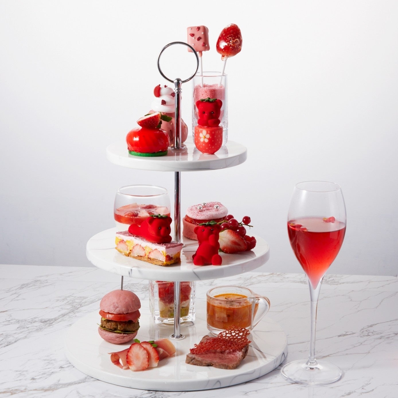 ウェルカムドリンクには、赤い果実の華やかな香りが広がるレッドベリーティーをご用意しました。スイーツは、苺にハーブやスパイスのニュアンスを重ねたムースやタルト、ミルフィーユなど、可憐で奥行きのある味わいが魅力。赤やピンクを基調に仕上げたセイボリーには、A5黒毛和牛のローストビーフや和牛ミニバーガーなど、満足感のあるラインナップを揃えました。