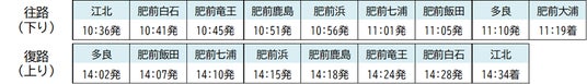 往路は、博多駅9:32 発の特急「みどり・ハウステンホ゛ス15 号」から江北駅でお乗換えできます。復路は、江北駅から14:39 発の博多行き特急「みどり36 号」にお乗換えできます。