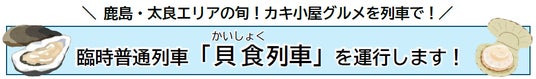 現在、旬のシーズンを迎えている「カキ」ですが、人気の鹿島・太良エリアの海岸沿いの「カキ小屋」を列車に乗って訪れ、カキをはじめとするグルメを味わっていただけるよう、期間限定で臨時列車を運転します。博多方面からも、特急列車にて江北駅で便利にお乗り換えいただけるダイヤの列車です。この機会にぜひ“貝食”列車で、ご家族やご友人とステキな“会食”をお楽しみください!