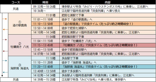 ・ 列車で行きやすいおすすめの店舗は別紙をご参照ください。・ 博多方面から貝食列車をご利用いただくには、「ちょいと“いいとこ”めぐりきっぷ」が