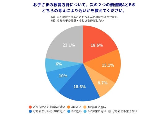 保護者に対し、「(A)みんなができることをしっかり身につけさせたい」「(B)うちの子の得意・個性を伸ばしたい」という教育方針のうち、どちらをより重視しているかをたずねました。