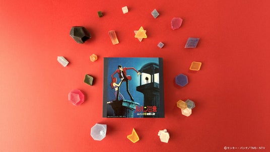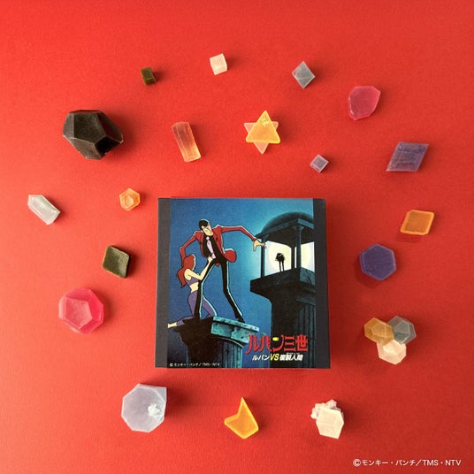 「ルパン三世」×こうぶつヲカシの限定デザインの琥珀糖が登場。『ルパン三世 ルパンVS複製人間』に登場する賢者の石をモチーフに、色鮮やかな宝石箱のように仕上げました。煌めく宝石の中央には、作品中で重要な賢者の石を配しています。職人がひとつひとつ切り出す宝石や鉱物のような美しい結晶を思わせる佇まいと、ひと粒ひと粒異なる表情を持つ繊細な造形は、まさに“観て楽しい、食べて美味しい”特別な逸品。ルパン三世の世界観と、現代的なフードアートが融合した、ファン必見の限定スイーツです。