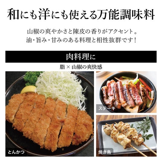 山椒の爽やかさと陳皮(ミカンの皮)の香りがアクセント。油、旨み、甘みのある料理と相性抜群です。