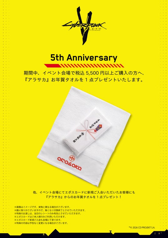期間中、イベント会場にてエポスカードに新規ご入会いただいたお客様へ『アラサカ』からのお年賀タオルを1点プレゼントいたします。