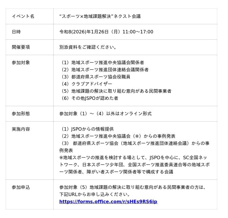 スポーツを「する」「みる」「ささえる」ための環境づくりを行うJSPO(正式名称:公益財団法人日本スポーツ協会 東京都新宿区/会長 遠藤利明)は、地域スポーツ活動の活性化に向けて、我が国が抱える社会課題や地域課題を共有し、解決に向けた取組を協議・検討し、幅広いニーズに応えられる地域のスポーツ環境の基盤強化を図ることを目的として、令和8(2026)年1月26日(月)に「“スポーツ×地域課題解決”ネクスト会議」を開催します。
