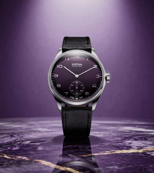新作「Grand Prix Small Second Purple」は、39mmのクラシックサイズとスリムなプロファイルにより、手首にしなやかに馴染むデザインを実現しました。文字盤には深みのあるパープルカラーを採用し、光の加減で表情を変えるサンバースト仕上げが、見る角度によって上品な陰影を生み出します。6時位置に配された小秒針は、1950~60年代のデザインへのオマージュとしてヴィンテージ感を演出すると同時に、現代的なエレガンスを加えています。